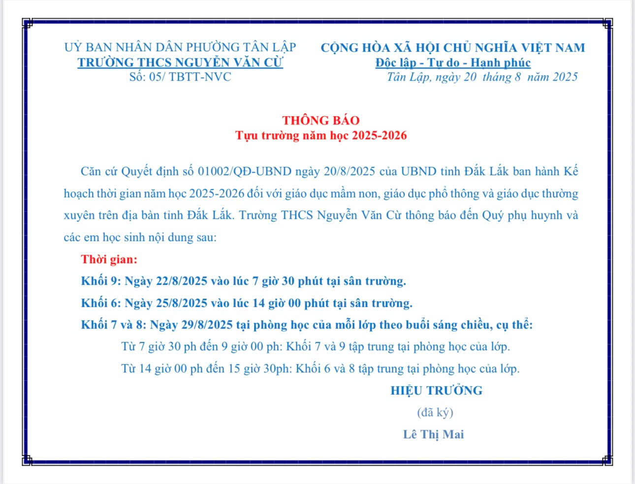 THÔNG BÁO LỊCH TỰU TRƯỜNG THCS NGUYỄN VĂN CỪ NĂM HỌC 2022-2023